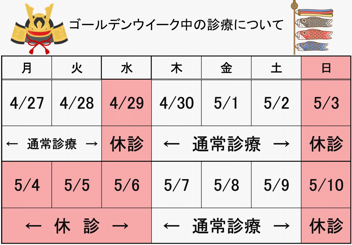 *上記、赤印の日程は休診とさせていただきます。 *5/7(木)からは通常診療となります。 *お薬が切れないよう、早めの受診をお願いします。