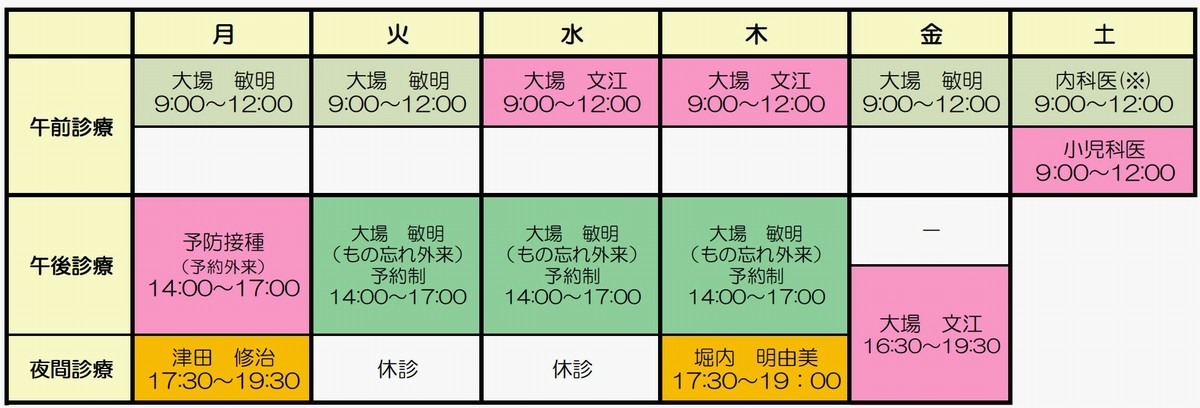 ※土曜日午前 担当内科医 1週目:堀内医師 2週目:大場文江医師 3週目:津田医師 4週目:大場敏明医師 5週目:大場文江医師